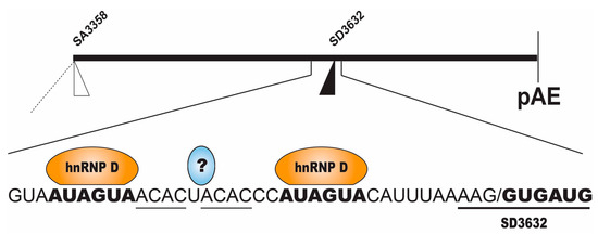 The HPV16 late 5′-splice site SD3632 is suppressed at the early stage of the HPV16 life cycle (Figure 3), including mitotic cells, high grade cervical lesions and cancer cells. This splice site is strongly suppressed by a sequence located immediately upstream of 5′-splice site SD3632 (Figure 5) [34,41]. The splicing inhibitory sequence encodes two AUAGUA-motifs and two ACAC-sequences (Figure 5) [41]. The two AUAGUA motifs binds specifically to hnRNP D, whereas the factor binding to the AC-rich motifs is yet unidentified (Figure 5) [41]. hnRNP D belongs to the hnRNP family and regulates splicing of cellular and viral mRNAs in addition to its ability to bind AU-rich RNA instability elements [27]. The specific binding of hnRNP D to splicing silencer sequences correlates with inhibition of splice site SD3632 [41]. The complex of proteins binding to the splicing silencer element also contains hnRNP A2B1. Therefore, hnRNP D proteins are suppressors of HPV16 SD3632.