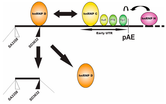 Regulation of the HPV16 early polyA signal pAE is key to the entry into the late stage of the HPV16 life cycle since inhibition of pAE allows read-through into the L2 and L1 coding regions and polyadenylation at the late polyA signal pAL (Figure 3). Mutational inactivation of pAE results in polyadenylation at nearby, upstream A-rich regions, demonstrating that adjacent regulatory elements promote polyadenylation in this region of the HPV16 genome [42,43]. Interestingly, the upstream HPV16 3′-splice site SA3358 appears to have a major impact on the HPV16 early polyA signal. If HPV16 SA3358 is not used, mutated or deleted, polydenylation does not occur at pAE [34]. This is of particular interest in the light of the fact that SA3358 is used throughout the HPV16 replication cycle, which opens the possibility for regulation of pAE through control of SA3358. That is, HPV16 SA3358 may be controlled by different factors during the HPV16 life cycle, and these factors may control different RNA processing events. The HPV16 early polyA signal pAE is controlled by upstream and downstream sequences (Figure 6) [43,44,45,46,47]. The upstream UTR is AU-rich and has a positive effect on pAE, but may also exert a more general regulatory function during the HPV16 life cycle [43,48]. It interacts with a number of cellular factors including polypyrimidine tract binding protein (PTB), RALYL, heterogenous nuclear ribonuclear protein C (hnRNP C), HuR and Fip1 (Figure 6) (unpublished data and [34,48]). PTB, RALYL and hnRNP C belong to the hnRNP family of proteins and all bind to pyrimidine rich or U-rich sequences to regulate polyadenylation and splicing [27] whereas HuR binds AU-rich RNA instability elements [49] and Fip1 is part of the polaydenylation complex [50]. Overexpression of PTB causes read-through at pAE, suggesting a regulatory function for PTB in HPV16 early polyadenylation [51]. Members of the hnRNP-family of hnRNPs (hnRNP C1 and RALYL) are also believed to control HPV16 pAE, but appear to play a more complex role as they also activate SD3632 in an HPV16 early UTR-dependent manner (Figure 6) [48]. Since HPV16 early polyadenylation and utilization of SD3632 are two mutually exclusive events, hnRNP C1 may be the switch between pAE and SD3632, a role that is likely to involve the hnRNP D protein that binds at SD3632 and suppresses this splice site [48].