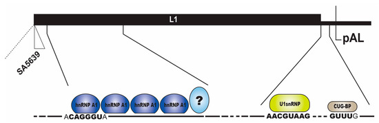 Schematic drawing of the late region of the HPV16 genome with the HPV16 3′-splice site SA5639 and the late polyadenylation signal pAL and the late untranslated region (UTR). The blow up shows the splicing silencer elements downstream of the suppressed HPV16 late 3′-splice site SA5639 [6,59,60]. These RNA elements consist of purine-rich sequences that bind hnRNP A1 [6,9,58,59,60]. Question marks indicate unidentified cellular proteins that bind to the splicing silencer. In addition to the splicing silencer elements downstream of SA5639, the HPV16 late mRNAs encode a negative regulatory element in the HPV16 late untranslated region [62]. The late UTR of many HPVs has an inhibitory function [63]. These elements consist of 5′-splice site-like sequences that bind to U1 small nuclear ribonucleoprotein (snRNP) to inhibit HPV16 late polyadenylation [64,65], and GU-rich elements that bind CUG-triplet repeat RNA binding protein (CUG-BP) [66], and other proteins [62]. Binding sites for hnRNP A1, U1 snRNP and CUG-BP are in boldface.