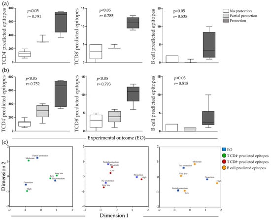 Correlation analysis: (a) Box plots of the relationships between T CD4+, T CD8+ and B cell epitopes and experimental outcome of candidate antigens taking into account cutaneous leishmaniasis (CL); (b) box plots of the relationships between T CD4+, T CD8+ and B cell epitopes and experimental outcome of candidate antigens concerning leishmaniasis diseases with no stratification; and (c) correspondence map showing the association between experimental outcome and T CD4+, T CD8+ and B cell predicted epitopes for leishmaniasis with no stratification.