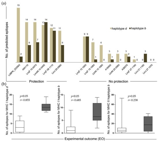 To hypothesize possible reasons linked with vaccine success or failure, an evaluation of allele-specific affinity (MHC I and II) was investigated. As illustrated in Figure 2a, the amounts of epitopes binding MHC haplotype d (BALB/c MHC alleles) and haplotype b binders (C57BL/6 MHC alleles) identified in the “protection” group were superior to those ones identified in the “no protection” group. In summary, our results indicate that epitopes for MHC class I and II haplotype b and d are more frequent in the success antigens tested for vaccine development. In addition, a detailed analysis in which MHC class I and II haplotypes were individually investigated revealed a strong association between NPE from MHC class I haplotype d and EO (p < 0.05 and r = 0.855) that is not observed for MHC class II haplotype d and b.