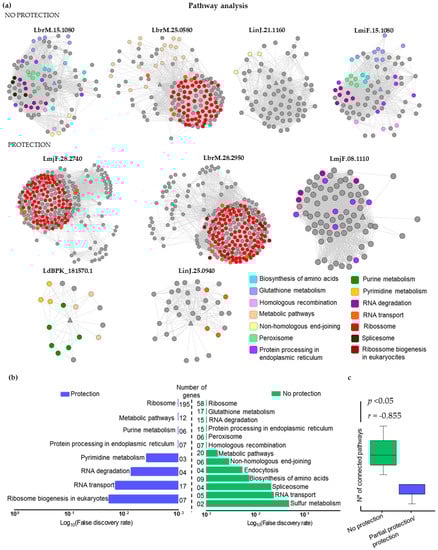 We chose Cytoscape to model PPI networks using data from STRING v.10. Figure 3a presents these networks, annotated according to their related KEGG pathways. Analyses of enriched pathways are shown in Figure 3b, according to their False Discovery Rate. Considering the “no protection” group, the most common pathways found were: ribosome (58 genes involved), glutathione metabolism (17 genes), RNA degradation (15 genes), protein processing in endoplasmic reticulum (15 genes), peroxisome (sixgenes) and homologous recombination (sevengenes). On the other hand, for “protection” group, we identified pathways as ribosome (195 genes involved), metabolic pathways (12 genes), purine metabolism (sixgenes) and protein processing in endoplasmic reticulum (seven genes). Interestingly, target proteins from “no protection” group are connected with nodes from many different pathways. In contrast, we observed that proteins of the “protection” group are connected to nodes of few pathways. Thus, there is a strong negative correlation (r = −8.55) between the number of connected pathways and EO of the selected proteins (Figure 3c).