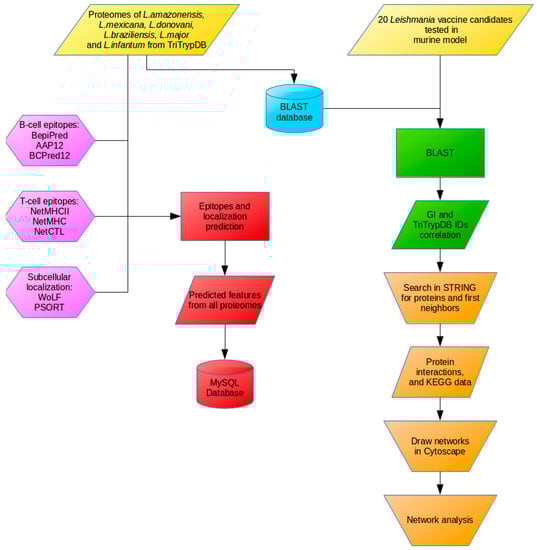 Nowadays, many computational methodologies have been described for epitope predictions of bacterial, fungal and others microorganisms. For protozoan (specifically Leishmania species), there are not strong and validated platforms to identify promising antigens for Leishmania vaccines []. Herein, we developed a sturdy and complete platform with potential of identifying candidates for vaccines against leishmaniasis. This platform integrates prediction of B and T cell epitopes, analysis of PPI networks and signaling pathways.