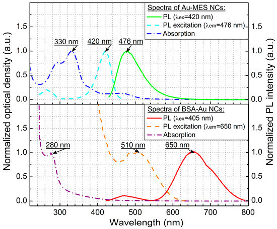Absorption, photoluminescence, and photoluminescence excitation spectra of freshly synthesized BSA-Au NCs and Au-MES NCs are presented in Figure 1.