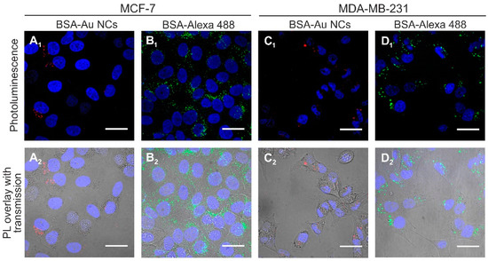Accumulation of photoluminescent BSA-Au NCs (λex = 488 nm) (A1,A2,C1,C2) and BSA-Alexa conjugate (λex = 488 nm) (B1,B2,D1,D2) in MCF-7 and MDA-MB-231 cells after 24 h of incubation, nuclei stained with Hoechst 33258 (λex = 405 nm). Scale bar is 30 μm.