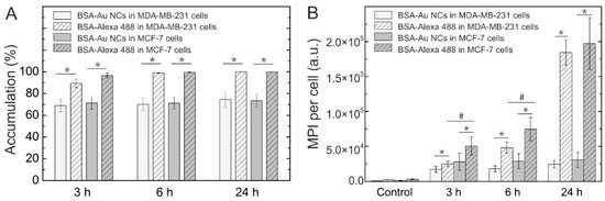 Accumulation of photoluminescent BSA-Au NCs and BSA-Alexa conjugate in MCF-7 and MDA-MB-231 cells after 3, 6, and 24 h of incubation. Percentage of the cells that have accumulated BSA-Au NCs and BSA-Alexa conjugate (A); mean PL intensity (MPI) of BSA-Au NCs and BSA-Alexa conjugate per cell (B). Control represents autofluorescence of non-treated cells. Error bars show the standard deviations. * indicates significant differences between accumulation of BSA-Alexa 488 and BSA-Au NCs (p ≤ 0.05); # indicates significant differences between the MCF-7 and MDA-MB-231 cell lines (p ≤ 0.05).