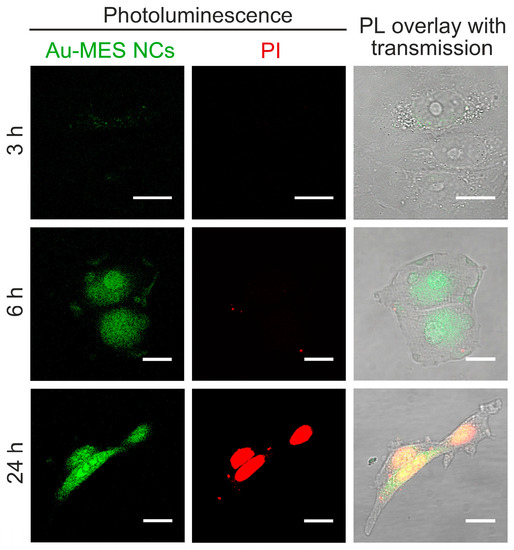 Accumulation of photoluminescent Au-MES NCs (λex = 405 nm) in MCF-7 breast cancer cells after 3, 6, and 24 h of incubation (green photoluminescence). Red fluorescence represents propidium iodide (PI) stained non-viable cells (λex = 488 nm). Yellow color in the merged pictures presents overlap of photoluminescence of Au-MES NCs and fluorescence of propidium iodide. Scale bar is 15 μm.