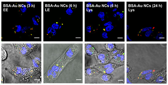 Intracellular distribution of photoluminescent BSA-Au NCs in early endosomes (EE), late endosomes (LE) and lysosomes (Lys). Yellow colour represents co-localisation of green fluorescent protein (GFP) labeled endosomal compartments and accumulated BSA-Au NCs. Scale bar is 10 μm.