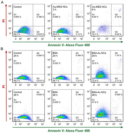 MDA-MB-231 cells were seeded in 24-well plates at a density of 5 × 104 cells per well in complete growth medium and let to adhere overnight. Cells were incubated with Au-MES NCs for 3 and 6 h, with BSA and BSA-Au NCs for 24 and 48 h. After the incubation cells were trypsinized, centrifuged at 200× g for 7 min, and washed with 1X Annexin-binding buffer (10 mM HEPES, 140 nM NaCl, 2.5 mM CaCl2) (Sigma-Aldrich, Taufkirchen, Germany) and centrifuged again. Cells were resuspended in 100 µL 1X Annexin-binding buffer, 4 µL Annexin V-Alexa Fluor 488 stock solution (Molecular Probes, Carlsbad, CA, USA) and 3 µL 100 µg/mL PI solution was added. Cells were incubated at room temperature for 15 min. After the incubation period, 300 µL of 1X Annexin-binding buffer was added and the samples were analyzed with flow cytometer. A minimum of 10,000 viable cells per sample were collected and analyzed. AnnexinV-Alexa Fluor 488 fluorescence emission was registered in FL1 (530/30), PI—in FL3 (670 LP). The data was analyzed with FlowJo (Tree Star, Inc., Ashland, Oregon, USA) or Accuri C6 software (Accuri Cytometers, Inc., Ann Arbor, Michigan, USA), electronic compensation between the red and green channels was performed to avoid spectral overlap. To exclude cell debris and doublets, cell population was chosen based on forward scattering (FSC) and side scattering (SSC). Dot plots were divided into quadrants according to Annexin V-Alexa Fluor 488 and PI-stained control. As BSA-Au NCs PL is registered in FL3, Q1 quadrant in BSA-Au-positive samples gives false-positive PI PL and was excluded from the analysis.