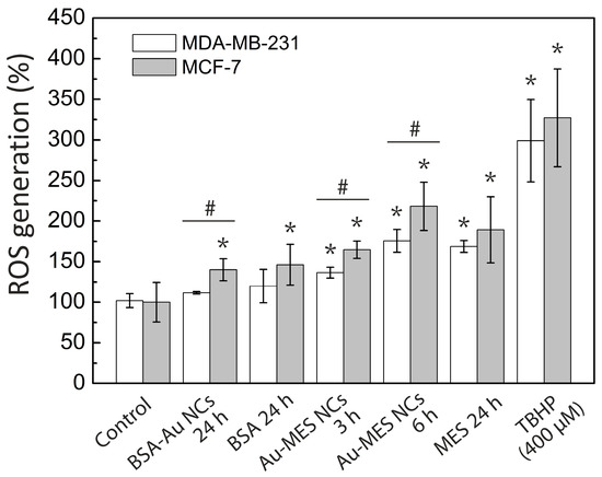 Reactive oxygen species (ROS) generation in MCF-7 and MDA-MB-231 cancer cells after treatment with BSA-Au NCs, Au-MES NCs, BSA, and MES. The data normalized according to the non-treated cells (Control), tert-Butyl hydroperoxide (TBHP) treated cells were taken as a positive control. Error bars show the standard deviations. * indicates significant differences compared to the non-treated cells (p ≤ 0.05); # indicates significant differences between the MCF-7 and MDA-MB-231 cell lines (p ≤ 0.05).