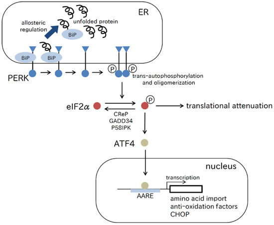 PERK is localized on the ER membrane, and detects the accumulation of unfolded proteins in the ER lumen. In the presence of ER stress, PERK is activated by trans-autophosphorylation and oligomerization. Activated PERK inactivates eukaryotic translational initiation factor 2 (eIF2α), which is the α subunit of eukaryotic initiation factor 2 by phosphorylation, leading to general inhibition of protein translation [11] (Figure 1). Although it remains obscure how the luminal domain of PERK detects unfolded protein accumulation in the ER, an important allosteric model of UPR induction was recently proposed in which the ATPase domain of the ER chaperone, immunoglobulin heavy-chain binding protein (BiP), interacts with the luminal domains of PERK and IRE1 (described below), which dissociates when an unfolded protein binds to the canonical substrate binding domain of BiP [12]. Salubrinal [13], guanabenz [14], and sephin1 [15], which inhibit dephosphorylation of eIF2α, protect cells from apoptosis and suggest that inhibition of protein translation by PERK has a cytoprotective effect. In contrast, phosphorylated eIF2α activates translation of genes that have short upstream open reading frames in their 5′-untranslated region, which leads to increased translation of genes such as transcription factor activating transcription factor 4 (ATF4). ATF4 upregulates genes involved in amino acid import, metabolism, and resistance to oxidative stress, which also confer a cytoprotective effect in the early phase of ER stress [16,17]. However, ATF4 activates C/EBP-homologous protein (CHOP), which is a proapoptotic transcription factor (discussed below), in the later phase of ER stress. CHOP inhibits function of B cell leukemia 2 (BCL2) family members, which protect cells from apoptosis, and therefore leads to cell death.