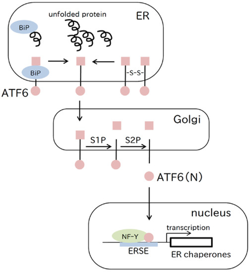 ATF6 is an ER membrane-located sensor protein, which also functions as a bZip transcription factor that enhances expression of ER chaperone genes. By sensing unfolded proteins in the ER, ATF6 translocates by coat protein complex II (COPII) vesicle transport from the ER to the Golgi, where it undergoes regulated intramembrane proteolysis (RIP) by Site-1 and Site-2 proteases [21,22]. Currently, there are two working models of the stress sensing mechanisms of ATF6. The first model is that BiP dissociation from ATF6 upon ER stress uncovers the Golgi localization signal of ATF6, which leads to ATF6 translocation to the Golgi [22,23,24]. The second model is that the luminal domains of ATF6 form dimers or oligomers by intermolecular disulfide bonds under normal conditions in the ER. In response to ER stress, the disulfide bonds of ATF6 are cleaved and the resultant monomeric ATF6 translocates to the Golgi [25,26,27] (Figure 2).