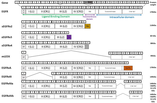 EGFR contains 30 exons and generates different mRNAs (Figure 2). Variant 1 mRNA is devoid of exons 16–17 and encodes the 170-kDa full-length EGFR. In addition to full length receptor, normal and tumour cells express soluble EGFR isoforms (sEGFR) that contain only the extracellular domain of EGFR. These sEGFR proteins can result either from alternative splicing or from proteolytic cleavage of the receptor [37,38]. Alternative splicing of the EGFR gene generates three variants that encode 110-kDa, 80-kDa, and 60-kDa sEGFR isoforms [39,40,41]. Soluble EGFR isoforms have been described in normal tissues, but they are highly expressed in human placenta; the 110-kDa isoform is the major one, suggesting a potential role in this tissue. Intra-tumoral and/or plasma/serum levels of sEGFR have been examined in tumour patients, but in most studies the data reflect overall sEGFR. Baron and colleagues were the first to report the presence of sEGFR in epidermal ovarian cancer (EOC) patients. They observed that the level of sEGFR is lower in patients harbouring EOC compared to healthy patients [42]. Similar results were reported in breast tumours [43] and non-small cell lung cancer (NSCLC) patients [44], suggesting that expression of sEGFR may have a physiological and protective role against cancer development. In this respect, sEGFR was proposed as a potential negative biomarker for the early detection in NSCLC [45]. On the other hand, other studies found significantly elevated sEGFR levels in cervical and gastric carcinoma compared to the healthy population [46], suggesting that sEGFR could also be a positive tumour marker. Moreover, clinical data regarding the potential of sEGFR as a prognostic biomarker in patients with various solid tumours remain controversial. Lower sEGFR levels were associated with reduced survival in advanced NSCLC patients [47] and in meningioma [12]. In agreement with an antiproliferative function, sEGFRs were reported to inhibit tumour cell proliferation and migration in NSCLC cell lines [48]. On the other hand, high levels of sEGFR were associated with a shorter survival rate in gastric cancer [46]. Therapeutic predictive values of sEGFR levels in blood have also been shown in some cancers. High levels of sEGFR may predict the response to tyrosine kinase inhibitors in colorectal cancer [49]. Low sEGFR levels are associated with shorter overall survival in patients with metastatic breast cancer treated with chemotherapy [50]. As a whole, these results highlight sEGFR as an interesting biomarker for diagnosis, prognosis, and response to therapy, but its overall role in cancer is still to be defined. Further investigations aiming at deciphering the identity (110-kDa, 80-kDa and/or 60-kDa EGFR isoforms) and origin (alternative splicing and/or proteolytic cleavage of EGFR) of the sEGFR isoforms expressed in these biological samples will probably help to understand the clinical data.