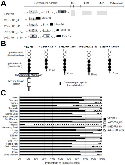 The different VEGFR1 splice variants, proteins and expression in tissues. (A) Schematic representation of full-length VEGFR1, sVEGFR1_i13, sVEGFR1_i14, sVEGFR1-e15a, and sVEGFR1-e15b mRNAs. Exons and introns are shown. TM: Transmembrane domain, KM1: ATP-binding domain, KM2: phosphotransferase domain; (B) Schematic representation of full-length VEGFR1 and sVEGFR1s proteins. Each splice variant isoform contains the first six extracellular Ig-like domains of VEGFR1, with (sVEGFR1-i14, sVEGFR1-e15a, sVEGFR1-e15b) or without (sVEGFR1-i13) a part of the last Ig-like domain, followed by a specific C-terminal end represented as a hatched box in the figure (adapted from [82]). aa represents the number of amino acids contained in the specific C-terminal part; (C) Percentage of expression of VEGFR1, sVEGFR1-i13, sVEGFR1-i14, and sVEGFR1-e15a mRNAs as indicated, according to the tissue type. sVEGFR1-e15b mRNA is undetectable in most of these tissues (adapted from [84]).