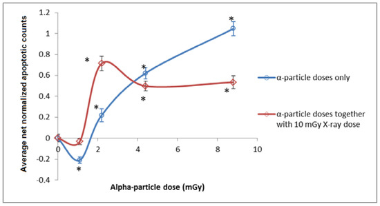 Net normalized apoptotic counts: (i) NAY+ and NAc+, (ii) NAXY+ and NAXc+ on 24-hpf zebrafish embryos which have been irradiated with (i) alpha-particle dose only, and (ii) alpha-particle dose + 10 mGy X-ray at 5 hpf. Error bars represent the standard errors. The lines joining the data points are drawn to guide the eye only. Comparisons are separately made for the five data points within case (i) or case (ii) through ANOVA. When p ≤ 0.05 from ANOVA, post-hoc t-tests are further performed to assess the difference between tested AY or AXY groups and the corresponding AC or AXC group. Significant differences from post-hoc t-tests are asterisked in Figure 1. * Statistically significant differences between the tested AY or AXY group and the corresponding AC or AXC group.