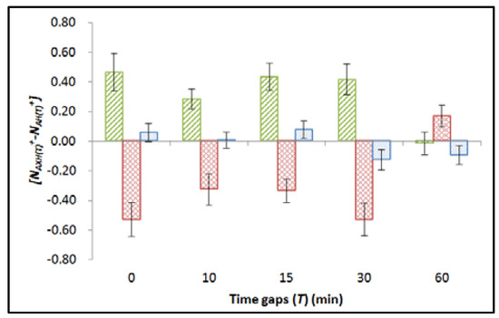 Differences between the net normalized apoptotic counts (NAXH(T)+ − NAH(T)+) on zebrafish embryos at 20 hpf (diagonally filled), 24 hpf (filled with diamond), and 30 hpf (filled with dots), which had been irradiated with an alpha-particle dose of 4.4 mGy at 5 hpf and an X-ray dose of 10 mGy, with T = 0, 10, 15, 30, or 60 (min) between the alpha-particle and X-ray irradiations. Error bars represent the standard errors. The error bars represent the standard errors.