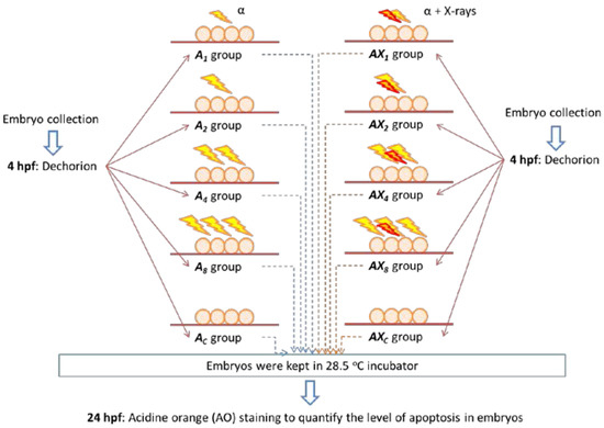 - AXH(T) group: embryos were irradiated with 4.4 mGy alpha-particle dose and then received 10 mGy X-ray dose with H = 24 (hpf) and T = 0, 10, 15, 30, or 60 (min);