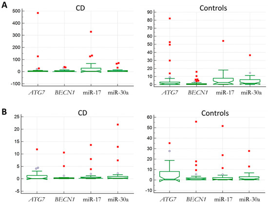 To identify novel molecular markers useful to increase the sensitivity and specificity in pediatric CD patients’ diagnosis, the expression levels of two main autophagy genes and their regulatory miRNAs were analyzed. Specifically, BECN1 and miR-30a, ATG7 and miR-17 were investigated. To this purpose, relative quantitative real-time-PCR was performed in blood and in intestinal biopsies derived from exploratory cohorts of pediatric CD patients with active disease compared with controls, as described in the Materials and Methods. Notched box-and-whisker plots of the expression levels of the analyzed markers in both tissues were reported (Figure 1). Among the investigated targets, miR-17 showed the greatest variability in the blood in CD patients and controls (Figure 1A), while, in intestinal biopsies ATG7 showed the widest range of variations (Figure 1B). In Figure S1, scatterplots highlight the general distribution of the analyzed samples.