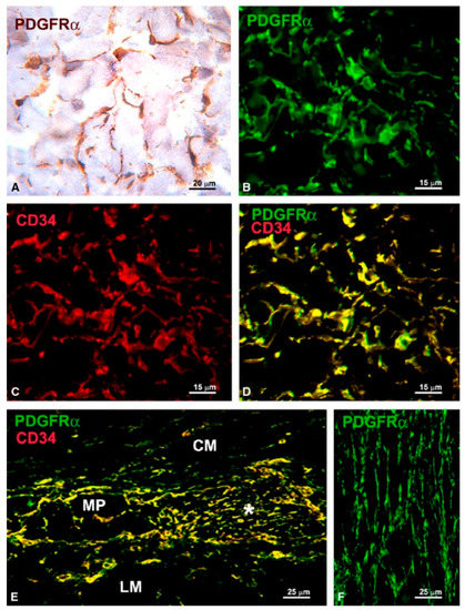 (A,B,F) PDGFRα-immunoreactivity; (C) CD34-immunoreactivity; and (D,E) PDGFRα/CD34 double labeling. (A) Immunohistochemistry, hematoxylin counterstain; (B–F) Immunofluorescence. (A–D) Submucosa (stomach). PDGFRα-positive cells (A,B) and CD34-positive cells (C) form a 3-D network. All the PDGFRα-positive cells are also CD34-positive (D). (E) Myenteric plexus region (large intestine). PDGFRα/CD34-positive cells surround a ganglion (left side, MP) and form networks in the intergangliar region (right side, asterisk). (F) Circular muscle layer (small intestine). PDGFRα-positive cells form networks among the smooth muscle cells. CM: circular muscle layer; LM: longitudinal muscle layer. Scale bars are indicated in each panel. Reproduced from [39], published under the Creative Commons license.
