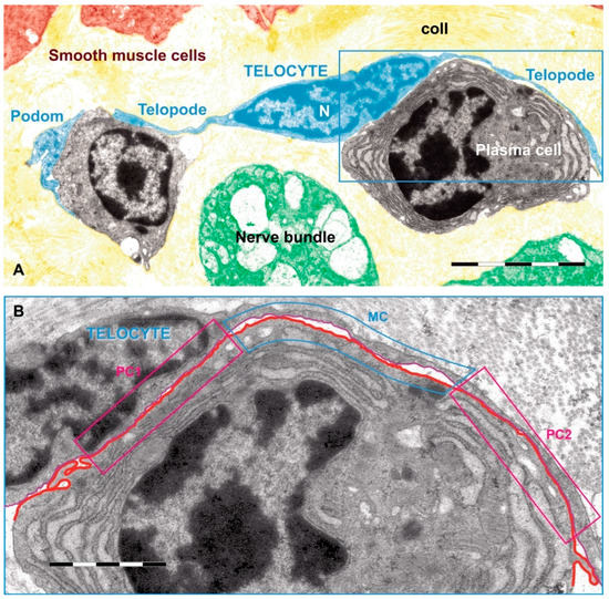 Rat jejunum mucosa: (A) A telocyte (blue) telopode is engaged in different types of synapses with a plasma cell, and two plain synapses (PC1 and PC2) and one multicontact synapse (MC) are seen; (B) region magnified from (A). Scale bar: (A): 5 µm, (B): 2 µm. Reproduced with permission from [44].
