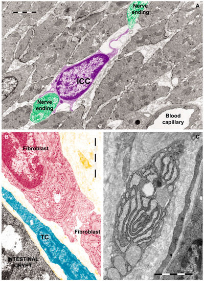 Rat jejunum: (A) Photomicrograph of an interstitial cell of Cajal (violet) in muscularis externa. Note the large cell body which extends a slender and relatively short connection towards the nerve endings (green); (B) Digitally colored TEM image showing a fibroblast (garnet) and a telocyte (blue) in the lamina propria; (C) Transmission electron micrograph (TEM) of a tangential section through a fibroblast cell. The internal structure can be seen, including the dilated rough endoplasmic reticulum responsible for synthesizing collagen. Reproduced with permission from [44].