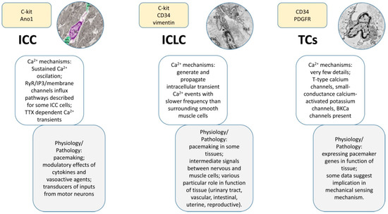 Compendious comparison of main features among the three types of cells described here: ICCs, ICLCs, and TCs. Knowledge about calcium signaling and related physiological processes are highlighted. As expected, the ICCs are the best described and the TCs the poorest. One can observe certain similarities between the ICLCs and the other two types of cells, explained by the fact that both cell populations co-exist under this acronym. Insets reproduced with permission from [44,157].
