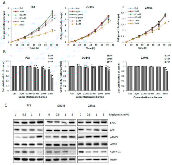 2.1. Metformin Decreases Cell Growth and Survival of Prostate Cancer (PCa) Cells