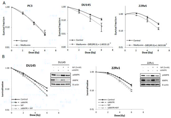 2.2. Metformin Increases Radiosensitivity of PCa Cells Independent of Adenosine Monophosphate (AMP)-Activated Protein Kinase (AMPK) Activation
