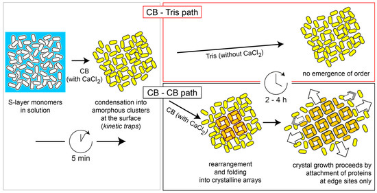 Schematic drawing of the two steps in the non-classical recrystallization process of the rSbpA S-layer protein. Adsorption of extended S-layer protein monomers in crystallization buffer (CB; containing CaCl2) from solution is completed within 5 to 10 min, leading to an irregular but complete coverage of the surface. At the same time, amorphous clusters of partially folded proteins are formed, which eventually transform within 2–4 h into crystalline arrays (in orange color) when crystallization buffer is added (CB–CB path). In the course of this step, the S-layer proteins undergo a refolding step into a more compact tetrameric form (in orange color). Crystal growth proceeds by attachment (and refolding) of new proteins at the edge sites of the growing lattice. In contrast, no crystalline lattice is formed (even not overnight) when only Tris—and no crystallization buffer is added (CB–Tris path).