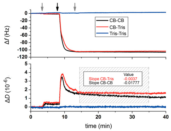 Figure 2 shows the change in frequency and dissipation for different buffer combinations (with and without Ca2+-ions) for the adsorption and lattice formation of rSbpA on hydrophobic silicon wafers. As observed, rSbpA injected into the crystallization buffer interacted very rapidly with the substrate and induced a frequency decrease (∆f) down to values around −100 Hz within the first 2–3 min, corresponding to an increase in deposited mass approximately of 1.8 µg/cm2. Frequency values remained constant then for the rest of the experiment—despite a thorough rinsing performed in the corresponding buffer solution (right grey arrow in Figure 2). An unambiguous differentiation between the influence of either the addition of crystallization buffer or, alternatively, the rinsing with pure Tris buffer (identically to crystallization buffer but without Ca2+; 5 mM Tris; pH 9.0) was only possible by careful evaluation of variations in dissipation (∆D). For comparison, the change in ∆f is not suitable for such a minute investigation. However, after rSbpA injection, the characteristic peak in ∆D is followed by two distinctive different post-rinse behaviors characterized by either no (CB-Tris) or a gradual (CB-CB) decay (Figure 2). The respective slopes indicate this difference (at a ratio of 1 to 5) within the dashed area shown in Figure 2. Since the total shift in ∆D (of around 0.5) for the CB–CB system represents a decrease of 30% from values already representing high compactness (as shown by the low starting value of ∆D = 1.5), the ongoing structural rearrangement is highly relevant for such a thin film.