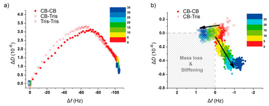 In this regard, the use of Tris buffer seemed to prevent the reorganization of the adsorbed protein film, contrary to what is observed in the presence of Ca2+-ions, which evolves towards a structure of higher rigidity within the following 20–30 min. A different approach to explore such a behavior is depicted in Figure 3a, where, in a color-coded way, the rSbpA–substrate interaction process may be analyzed by displaying the changes in ∆f and ∆D simultaneously over time. The almost identical behavior in ∆f during the first 5 min for both systems in the presence of Ca2+, including the aforementioned transition peak at −65 Hz, differs drastically after rinsing with different buffers. A closer look at such post-rinsing behavior (Figure 3b) clearly indicates the continuing dense packing experienced for rSbpA in a crystallization buffer as compared to almost no variation recorded in the Tris buffer (see Figure 1 for a schematic drawing). The slight mass uptake measured for the system under reorganization may be interpreted as further proof of the transformation of the amorphous clusters into an array of compact tetramers, and, in this way, the refolding of the monomer upon crystal formation.