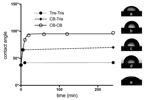 The relationship of the crystalline state and hydrophobicity of the supporting silicon surfaces were investigated by determining the contact angles of S-layer coated silicon wafers after 5, 10, 20, 60, 120 and 240 min incubation times. S-layer solution was applied at a concentration of 50 µg/mL in crystallization buffer for 5 min. After a washing step, incubation time was prolonged in crystallization buffer for 5, 10, 20, 60, 120 and 240 min (CB–CB path). The CB-Tris path was monitored by further incubation in Tris for 10 min and 240 min. An uncoated wafer and a wafer where the S-layer protein was applied and, after a washing step, further incubated in Tris buffer but in the absence of CaCl2 for 10 min and 240 min (Tris-Tris path), were used as blank or for comparison, respectively. Contact angles were determined with a Kruess EasyDrop instrument (Kruess, Hamburg, Germany) using 8 µL Milli-Q water droplets.