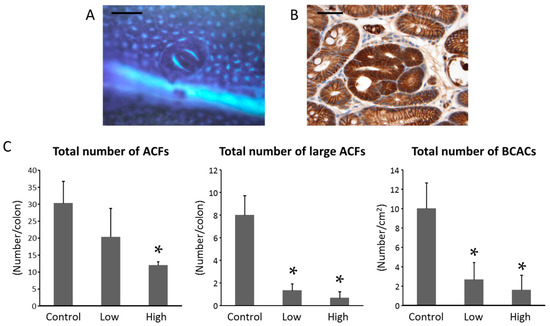 The frequencies of ACF and BCAC were determined according to previously reported procedures [14,24,25]. The resected colons were fixed in 10% buffered formalin for 24 h, the mucosal surfaces were stained with 0.5% methylene blue, and the number of ACF was counted under a microscope. After counting the ACF, the distal part (1 cm from the anus) of the colon was cut, embedded in paraffin, and stained immunohistochemically for β-catenin to identify the BCAC intramucosal lesions.
