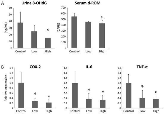 Oxidative stress and expression levels of genes related to inflammation in the colonic mucosa of experimental mice. (A) Measurement of urine 8-hydroxy-2′-deoxyguanosine (8-OHdG) and serum derivatives of reactive oxygen metabolites (d-ROMs) levels (Ctrl, n = 9; Low, n = 11; High, n = 10); (B) The mRNA expression levels of cyclooxygenase (COX)-2, interleukin (IL)-6, and tumor necrosis factor (TNF)-α in the colonic mucosa were measured by quantitative real-time reverse transcription (RT)-PCR with specific primers (n = 6 for each group). Triplicate experiments were performed. Each column represents the mean ± SD. * p < 0.05.