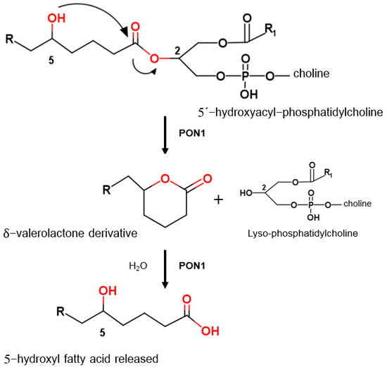 Proposed biological role of paraoxonase 1. Adapted from [7], reproduced with permission from the American Society for Biochemistry and Molecular Biology. Although 5-hydroxy fatty acids are not frequent in normal physiology, they appear during inflammatory processes in macrophages and dendritic cells due to the action of cytochromes P-450 and 5′-lipooxygenase [9]. The extent to which they can esterify to form phosphatidylcholine is unknown.