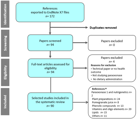 In light of the above, PON1 could be partly responsible for the anti-inflammatory and antiatherogenic properties of HDL molecules in blood [10]. Serum PON1 activity has been inversely associated with the risk of cardiovascular disease [11] and has been found to be decreased in several situations associated with atherosclerosis and oxidative stress [12]. Direct proof of its effects on atherosclerosis development was obtained from Pon1-deficient mice [13] and their counterparts overexpressing human PON1 gene [14]. As such, PON1 plays a major role in the protective role of HDL, and its status is considered to be one of the determinants that predispose people to coronary artery and other diseases [12]. Since PON1 undergoes inactivation by oxidative stress, its activity needs to be preserved [10]. Given the panoply of positive actions of PON1, pharmacological and nutritional modulation of PON1 activity and/or gene expression could constitute a useful approach to the prevention of cardiovascular and other diseases, such as diabetes, Alzheimer’s disease, chronic renal failure, and chronic liver impairment [15]. A recent review concerning PON1 and the Mediterranean diet analyzed the impact of this diet [16]. Dietary supplements also represent a new approach to enhancing population-based health [17]. In this work, we have searched for evidence of the effect of dietary supplements and plant extracts on PON1 by way of a strategy following systematic review guidelines [18]. As displayed in Figure 2, a search in PubMed using the keywords (paraoxonase and dietary supplements and paraoxonase and plant extracts), or (“aryldialkylphosphatase” [Mesh]) AND (“Plant Extracts” [Mesh] OR “Dietary Supplements” [Mesh]) identified 172 hits between November 1945 and 04 October 2016. The search was refined by eliminating duplicate documents. The 94 papers obtained were critically reviewed to verify whether they analyzed PON1 and dietary administration. Documents that failed to meet this criterion were excluded. Thus, this review covers the studies related to the effects of dietary supplements and PON1 published in 90 papers.