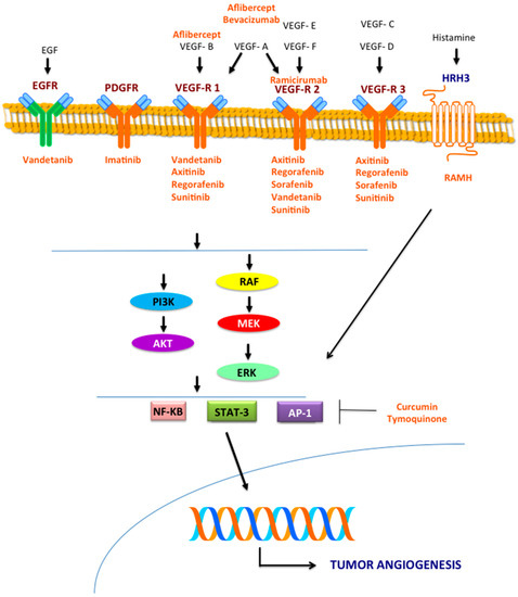 NF-kB, signal transducer and activator of transcription (STAT)-3 and activator protein (AP)-1 also regulate the expression of various genes involved in proliferation, apoptosis, inflammation and angiogenesis [58,59] thus representing potential therapeutic targets of anti-angiogenic drugs. Particularly, STAT3, when constitutively activated, as in experimental models, causes an enhanced expression of VEGF [58].