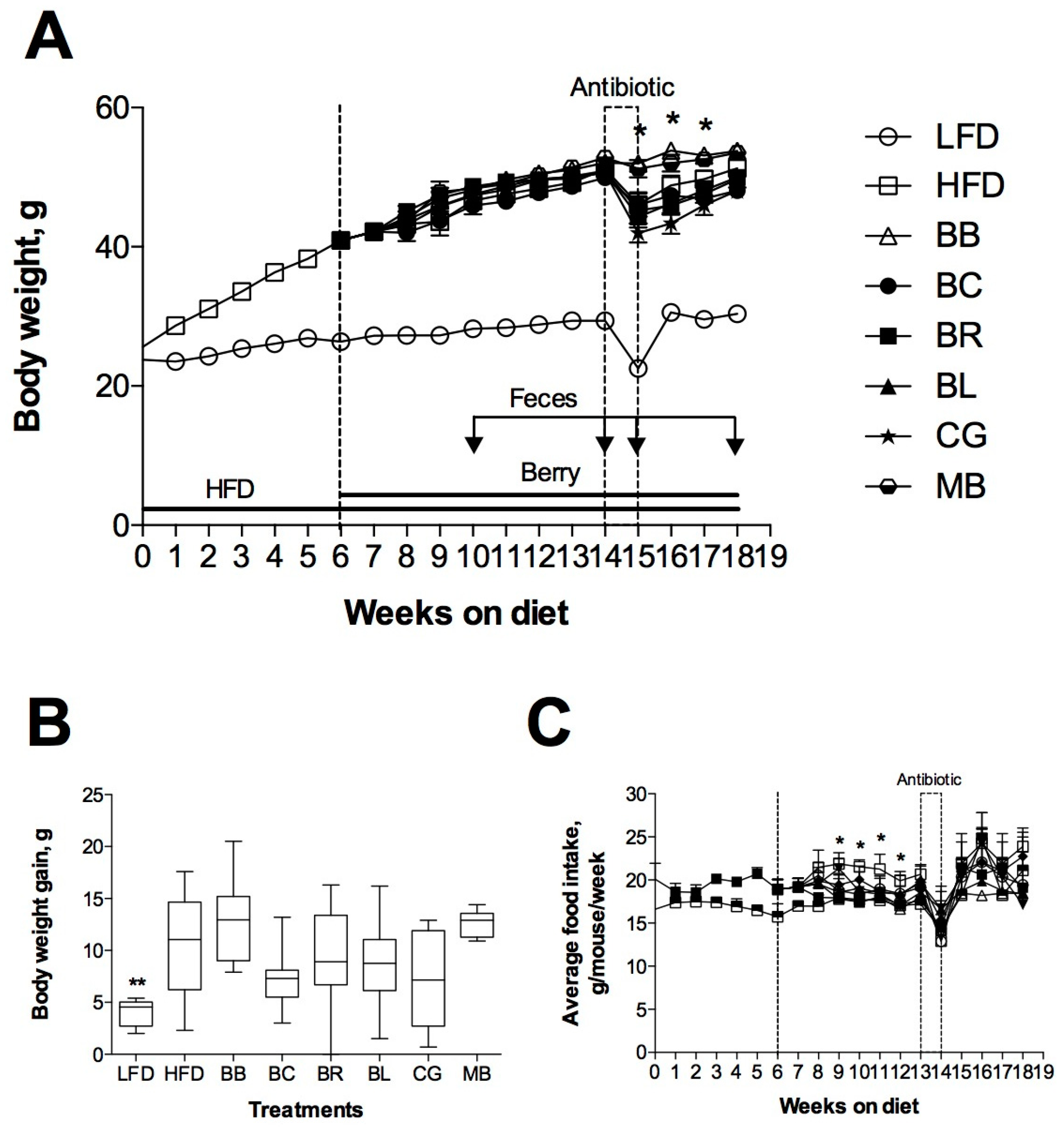Effects of berry supplementation on: body weight (A); body weight gain (B); and food intake (C) of C57BL/6J mice. Mice were fed low fat diet (LFD) or high fat (HFD) for six weeks. DIO mice were further randomized to control (HFD) and berry diets (BB, blackberry; BC, blackcurrant; BR, black raspberry; BL, blueberry; CG, Concord grape; MB, maqui berry) normalized to contain 400 µg/g anthocyanins for additional 12 weeks. An antibiotic cocktail was administered for one week in drinking water (Weeks 14–15 of the study) and feces were collected as indicated by arrows. Results are expressed as means ± SEM, n = 8. Body weight and food intake were analyzed by 2-factor repeated measures ANOVA, with time and treatment as independent variables. * p < 0.05, ** p < 0.01 vs. HFD control.