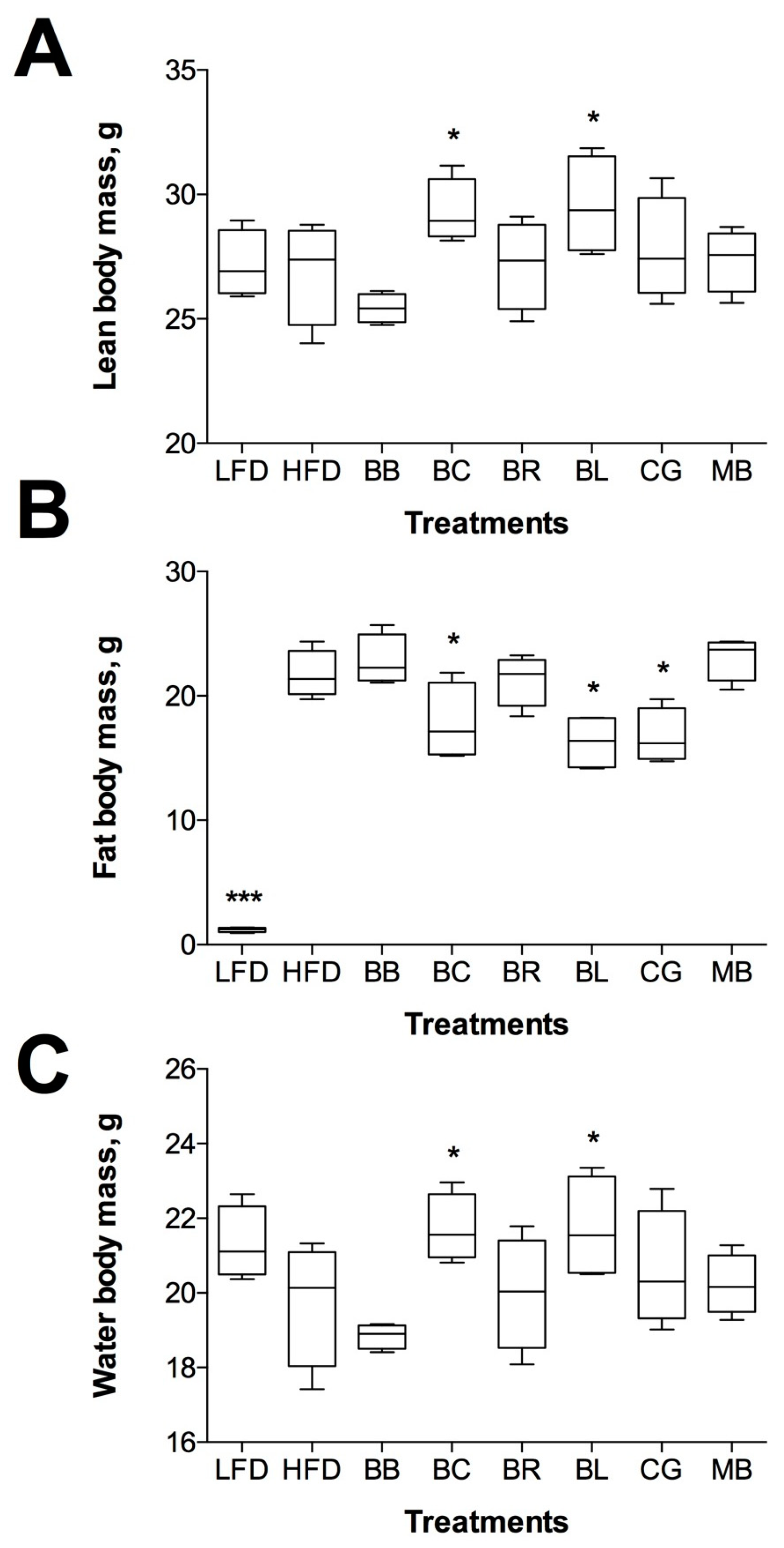 Effects of berry supplementation on body composition: (A) lean body mass; (B) fat body mass; and (C) total water are reported as means ± SEM. * p < 0.05 and *** p < 0.001 when compared to HFD by one-way ANOVA followed by Dunnett’s post hoc test.