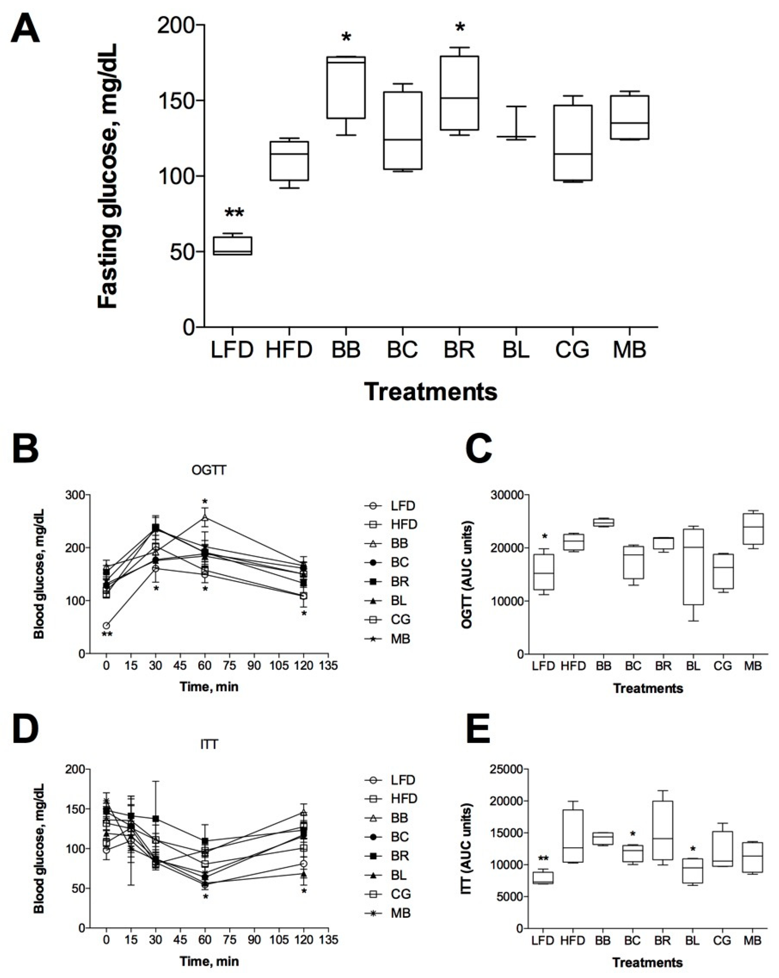 Insulin-sensitizing effect of berry supplementation: (A) Fasting blood glucose; (B) oral glucose tolerance test; and (C) respective AUCs; and (D) insulin tolerance test; and (E) respective AUCs are reported as means ± SEM. * p < 0.05 and ** p < 0.01 when compared by two-factor repeated measures ANOVA (B,D); or one-way ANOVA followed by Dunnett’s post hoc test.