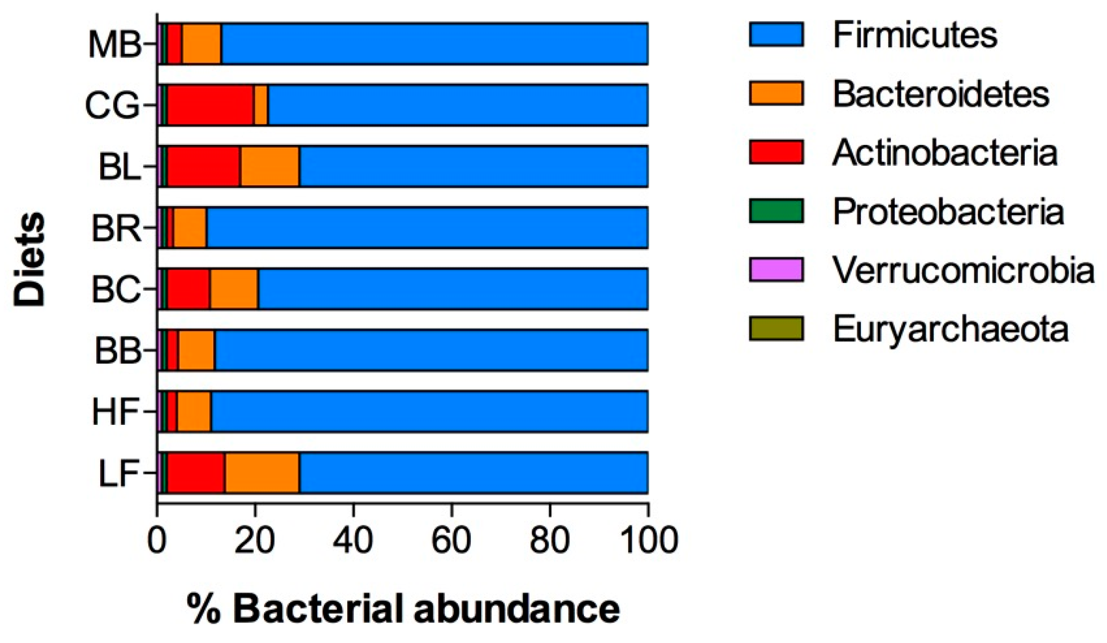 Gastrointestinal bacterial profiles were strongly affected by HFD and berry diets. Analysis of bacterial relative abundance in fecal samples showed that Firmicutes were the largest group of bacteria in healthy LFD animals (71%) that was further expanded to 89% with HFD diet. This expansion was achieved by the significant decreases in the obligate anaerobe populations of Bacteroidetes and Actinobacteria (Figure 5). Berry supplementation with blackberry and black raspberry did not change this trend. Animals consuming Concord grape showed the largest expansion of Actinobacteria from 2% to 18% relative to HFD controls. Blueberry and blackcurrant supplementation was associated with significant shifts in the fecal bacterial profiles that simultaneously increased populations of obligate anaerobes Bacteroidetes (from 7% to 10%–12%) and Actinobacteria (from 2% to 9%–15%). While the mechanism responsible for these shifts are not clear, it is possible that consumption of berries and specifically anthocyanins reduced oxygen tension in the gut lumens, thus promoting growth of oxygen-sensitive bacterial populations.