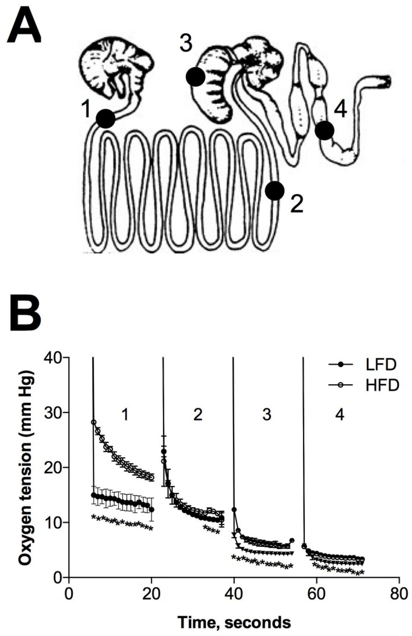 At the end of the experiment, mice were euthanized and blood was collected by heart puncture. Oxygen levels in freshly dissected digestive tracts were measured with 0.3 mm Clark-type oxygen microelectrode ET1125, EPU354 isoPod, and Pod-Vu software v5.5.20 (Edaq, Colarado Springs, CO, USA). Electrode was zeroed in water sparged with nitrogen (1 min/mL water) and calibrated in distilled water saturated with air (20.9% oxygen). The accuracy of the microelectrode to reach zero and 20.9% oxygen was rechecked periodically during experiments. Microelectrode was inserted through a small hole cut into the gut wall and all readings were completed in 15 s intervals within 4 min after dissection. Percent oxygen was measured in the duodenum, ileum, cecum, and colon at ambient temperature (23 ± 1 °C) and local barometric pressure (National Weather Service). Oxygen partial pressure (1 mmHg = 133.322 Pa = 1 torr) was calculated from percent oxygen reading recorded at −800 mV polarization.