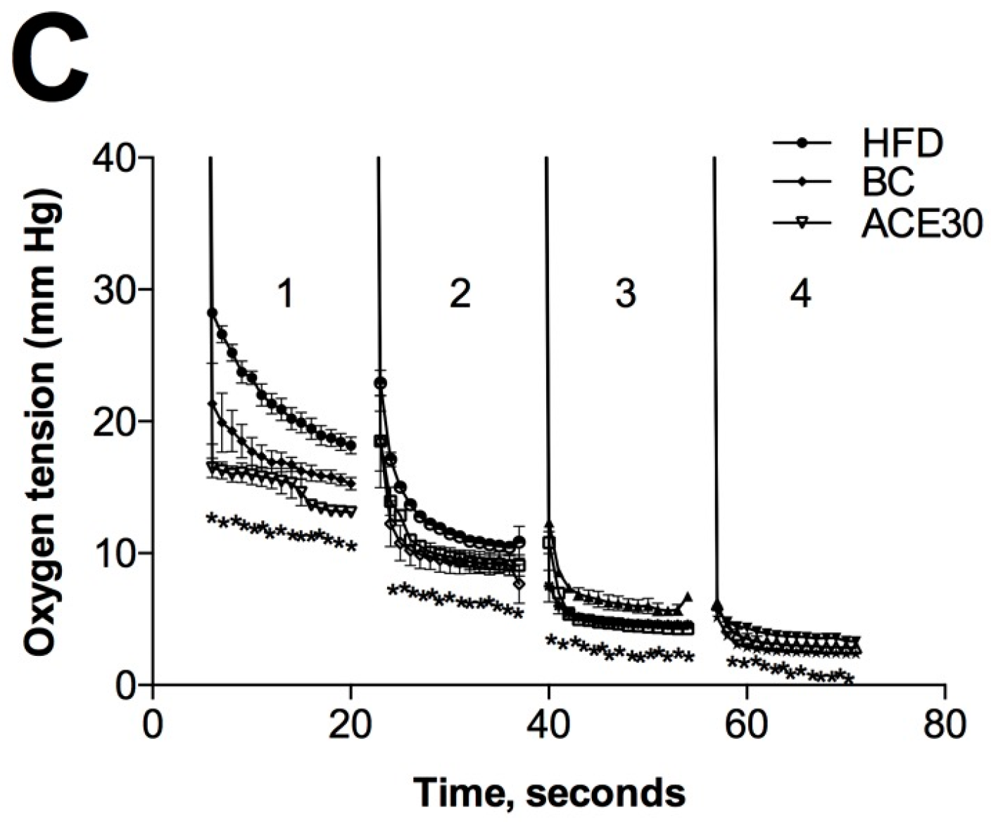 Gut luminal oxygenation profiles of different gastrointestinal regions of mice following 12-week berry supplementation: (A) schematic representation of mouse gastrointestinal tract including duodenum (1), ileum (2), cecum (3), and colon (4) sections; (B) oxygen tension curves of LFD and HFD animals indicated significant increases in gut luminal oxygen content of the HFD animals; and (C) oxygen tension curves in mice supplemented with blackcurrant or blackcurrant anthocyanins (ACE30 extract) showed decreased oxygen concentration within the gastrointestinal lumen when compared to HFD controls. Data are reported as means ± SEM. * p < 0.05 when compared to by two-factor repeated measures ANOVA.