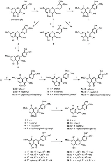 Synthetic plan of O-methylquercetins (2–16) and O-methylanthocyanidins (17–23). (a) MeI (29 eq.), NaH (7.6 eq.), DMF, 80 °C; (b) NIS (1.2 eq.), DMF, 70 °C; (c) BBr3 (2.0 eq.), MeCN, rt; (d) BBr3 (2.0 eq.), CH2Cl2, −30 °C; (e) BBr3 (3.0 eq.), CH2Cl2, 0 °C; (f) BCl3 (5.3 eq.), TBAI (5.3 eq.), CH2Cl2, −20 °C; (g) 8: phenylboronic acid (2.0 eq.), Pd(OAc)2 (3.0 mol %), K3PO4 (3.0 eq.), toluene, 100 °C; 9: 1-naphthalenebronic acid (2.0 eq.), Pd(OAc)2 (3.0 mol %), K3PO4 (3.0 eq.), PPh3 (3.0 mol %), CPME, 100 °C; 10: 4-(diphenylamino)phenylboronic acid (1.5 eq.), Pd(OAc)2 (1.5 mol %), K2CO3 (2.0 eq.), EtOH/H2O, 80 °C; (h) BBr3 (3.0 eq.), CPME, 0 °C → rt; (i) BCl3 (5.3 eq.), TBAI (5.3 eq.), CH2Cl2, −20 °C; (j) LiAlH4 (4.0 eq.), THF, rt; (k) Zn, HCl-MeOH, 0 °C and then air, HCl-MeOH, rt.