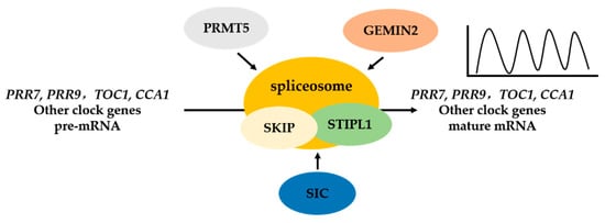 Components of spliceosome and splicing regulators mediate alternative splicing of the circadian clock genes in Arabidopsis. The Ski-interacting protein (SKIP), SPLICEOSOME TIMEKEEPER LOCUS 1 (STIPL1) are components of the spliceosome. Protein arginine methyltransferase 5 (PRMT5), GEM NUCLEAR ORGANELLE ASSOCIATED PROTEIN 2 (GEMIN2), SICKLE (SIC) are regulators of spliceosome. These splicing factors are involved in regulating the circadian clock through alternative splicing of clock genes pre-mRNAs, such as PRR7, PRR9, TOC1, CCA1. These studies suggest that pre-mRNA splicing, a post-transcriptional gene expression regulation, is a new means of circadian clock regulation.