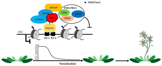 As mentioned above, SR proteins play important roles in constitutive splicing and AS, and in other aspects of mRNA metabolism. The Arabidopsis SR45 protein was first identified in a yeast two-hybrid screen as an interacting partner of U1-70K [], a component of the U1 snRNP known in animals to initiate spliceosome assembly by binding 5′ pre-mRNA splice sites [,]. SR45 can also interact with the spliceosomal factor U2AF35, which is involved in 3′ splice site recognition [,]. Moreover, SR45 has been found to interact with three U5 snRNPs [] as well as with several other Arabidopsis SR proteins; namely, SCL33, RSZ21, SR30, SR34, and SR34a [,,]. Two other reported SR45-interacting proteins in Arabidopsis are the spliceosomal component SKIP [], which confers salt stress tolerance [], and CACTIN, an essential nuclear factor required for embryogenesis []. The sr45-1 mutant exhibits delayed flowering under both long- and short-day conditions and can be rescued by vernalization. FLC, a key flowering repressor, is up-regulated in sr45-1. Recently, proteomics was used to identify the SIN3-associated protein 18 (SAP18) and its two partners, the RNA-binding protein SR45 and the SAP-domain protein ACINUS. SAP18 is a component of the SIN3-histone deacetylase complex, which is required in humans to enhance the SIN3-mediated repression of transcription []. SAP18 has also been linked to RNA processing and degradation and is a subunit of the conserved apoptosis- and splicing-associated protein complex. Together with SR45 and ACINUS, SAP18 is required for VAL1-mediated FLC silencing [] (Figure 4).