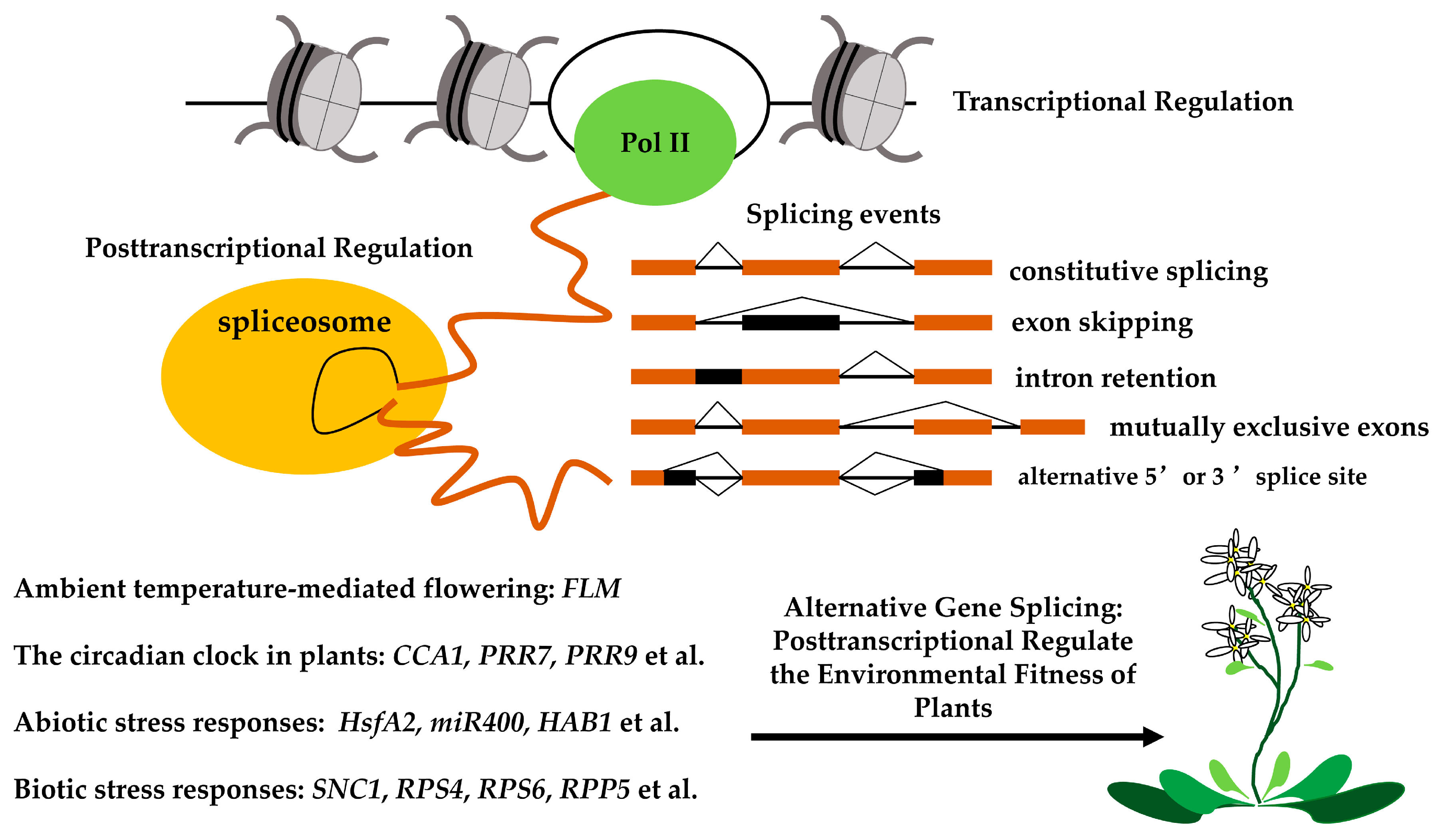 Previous studies focused on the role of gene expression in plants in response to environmental changes at the transcriptional level. However, accumulating evidence supports the idea that the post-transcriptional regulation of gene expression plays critical roles in the response of plants to environmental changes as well. AS is a key process in post-transcriptional gene regulation; thus, it is a new means of regulating the environmental fitness of plants (Figure 5).