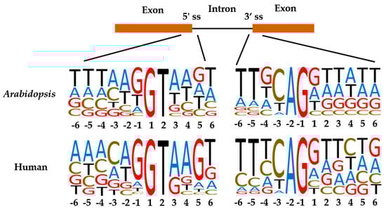 Plant and animal introns have similar 5′ and 3′ splice sites (GU-AG). However, compared to those in animals, plant introns have their own characteristics in terms of size, nucleotide composition, branch point sequence, and polypyrimidine tract. These differences indicate that some of the initial events in splice site recognition are likely unique to plants (Figure 6) [,].