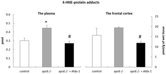 The level of 4-hydroxy-2-nonenal (4-HNE)-protein adducts in the plasma and the frontal cortex of control mice, apolipoprotein E (apoE)−/− mice and Alda-1-treated apoE−/− mice. The data are presented as the mean ± SEM, with n = 3 for each group. * p < 0.05 vs. control group; # p < 0.05 vs. apoE−/− group.