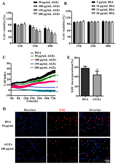To study the effect of AGEs on cells proliferation, HUVECs were incubated with different concentrations of AGEs (50, 100, 150 and 200 µg/mL) or different concentrations of bovine serum albumin (BSA) (5, 10, 15 and 20 µg/mL) as control for different times (12, 24 and 48 h). Methyl thiazolyl tetrazolium (MTT) assay demonstrated that AGE treatment could dramatically decrease the proliferation of HUVECs in a time- and concentration-dependent manner (Figure 1A,B). This was confirmed by the results of the real-time cell analyzer (RTCA) which could monitor cell proliferation continuously and dynamically (Figure 1C). Based on these results, we treated HUVECs with 100 µg/mL AGEs for 24 h in subsequent experiments. 5-Ethynyl-2′-deoxyuridine (EdU) incorporation assay indicated AGEs could significantly inhibit DNA synthesis in HUVECs (Figure 1D,E).